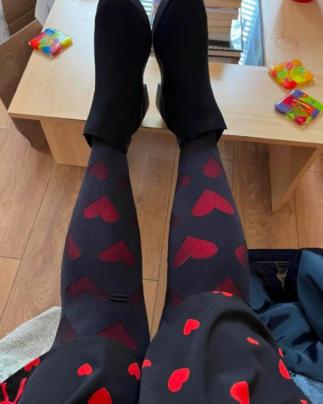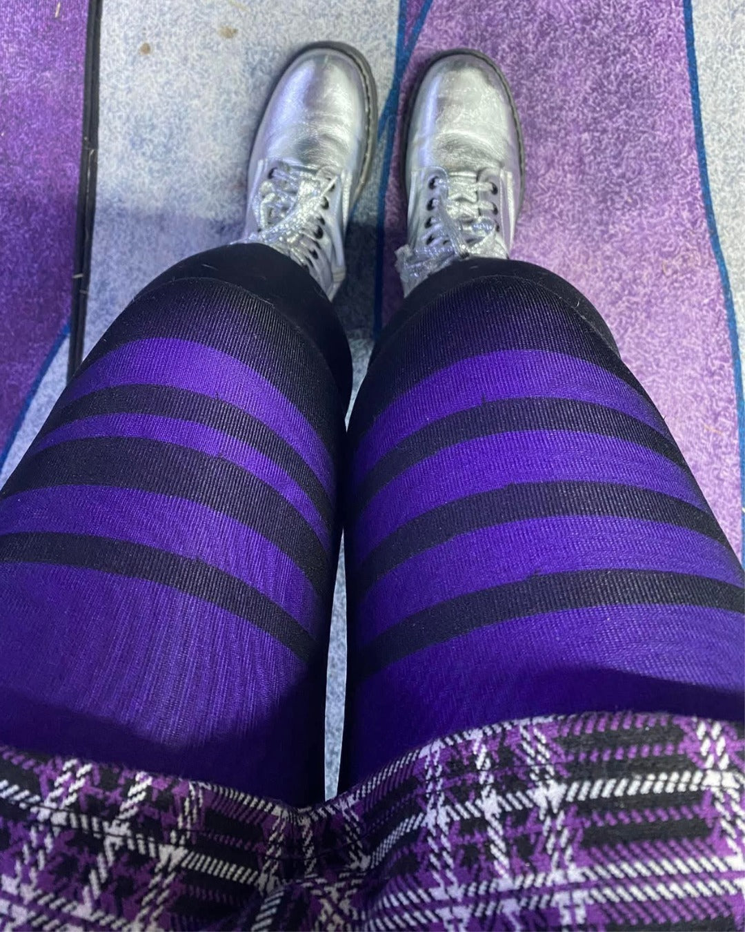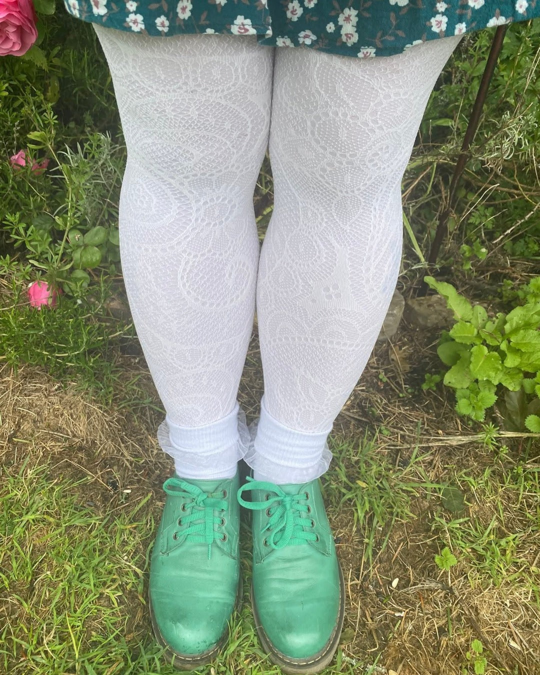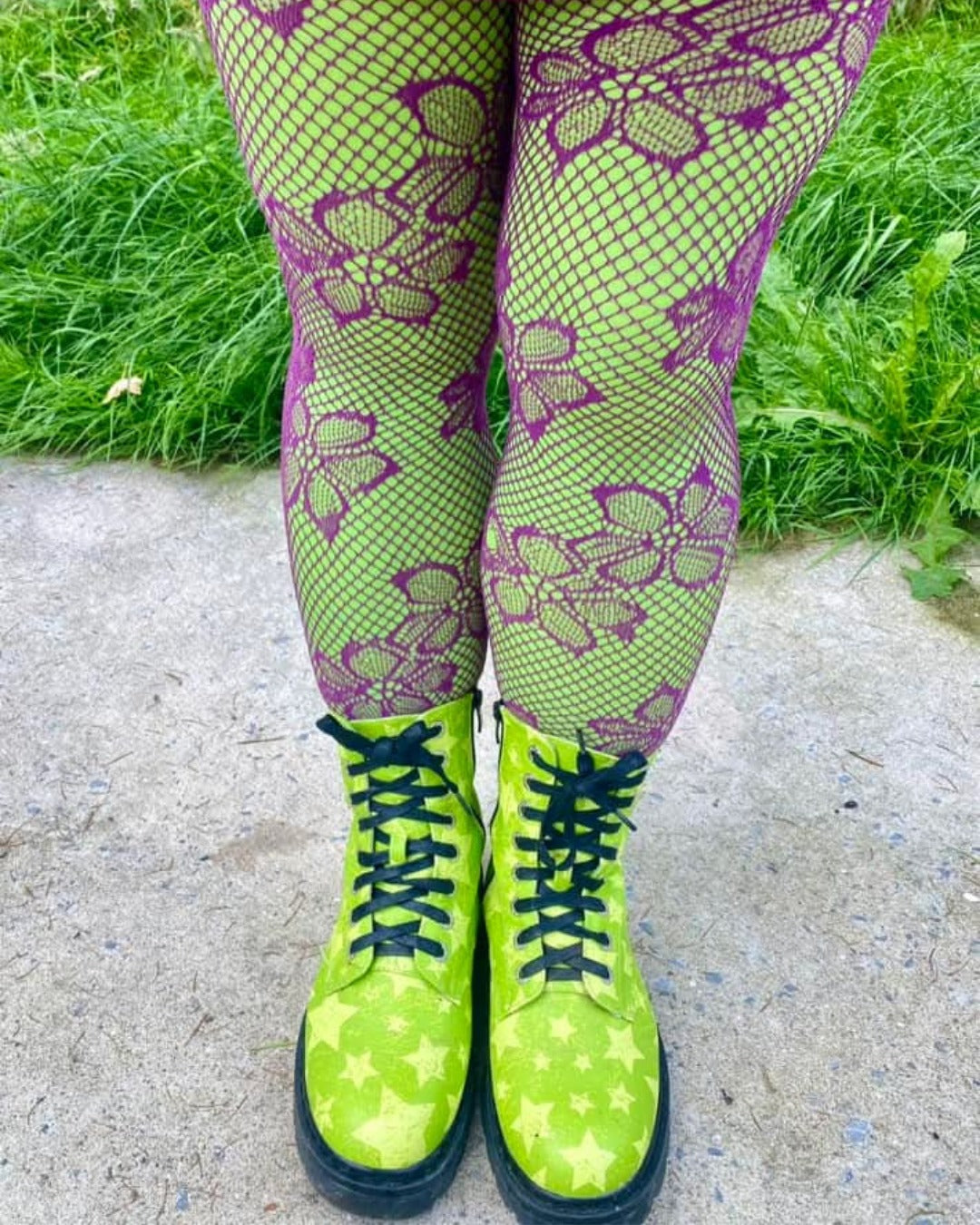 Jetzt kommt der spaßige Teil. Zieh einfach eine Netzstrumpfhose oder eine gemusterte Strumpfhose mit verschiedenen DEN-Stärken darüber, um für mehr Textur zu sorgen. Ein Klassiker in Schwarz oder Weiß über einer farbigen Basis geht immer, aber auch eine bunte Netzstrumpfhose in einer Kontrastfarbe sieht mega aus!