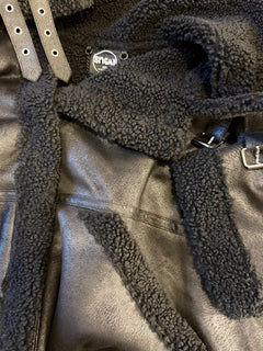 Markante silberne Hardware, Schnallendetails am Kragen, ein glänzender Frontreißverschluss und die charakteristische Nackenkette aus Metall sorgen für den nötigen Rock'n'Roll-Swagger. Die tiefen, schrägen Seitentaschen sind mit demselben kuscheligen Kunstfell gefüttert und bereit für dein Handy, Schlüssel und Lippenstift – alles, was du für den Start brauchst.