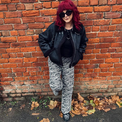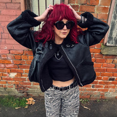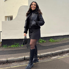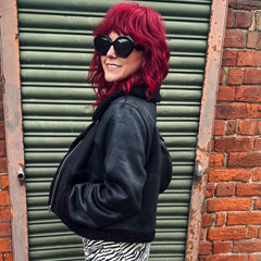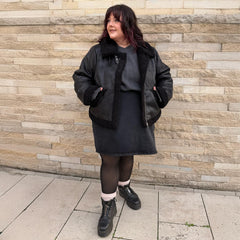 Schnall dich an und lern die schwarze Bessie Aviator Jacke mit Borg-Futter kennen! Das ist pure Aviator-Attitüde, verpackt in einer Teddybär-Umarmung. Diese vegane, kurz geschnittene Jacke besteht aus ultraweichem Veloursleder-Imitat mit plüschigem Borg-Besatz am Kragen und an den Ärmelsäumen. Zieh den Reißverschluss einmal zu und du bist sofort in puren Luxus gehüllt, der sich anfühlt, als hättest du an einem kalten Wintermorgen einfach deine Bettdecke mitgenommen.