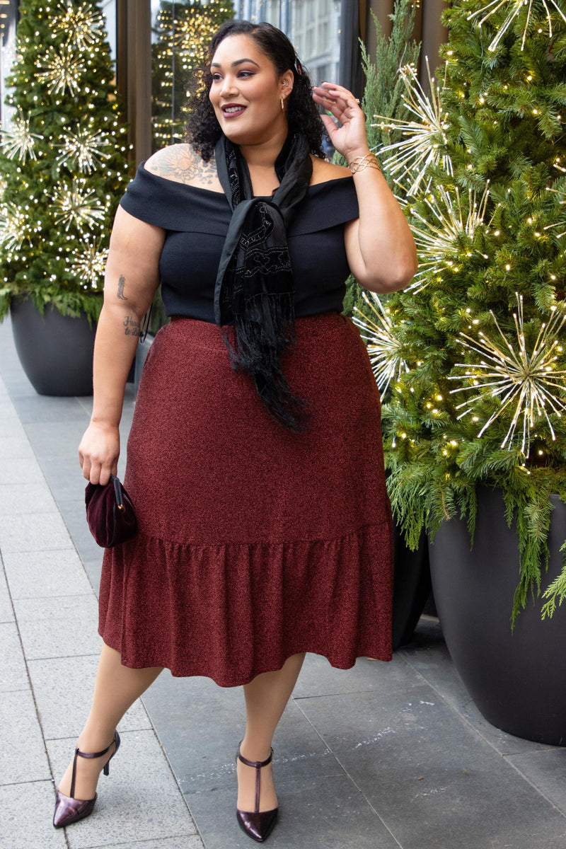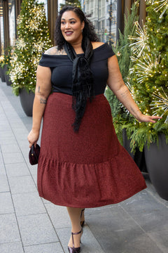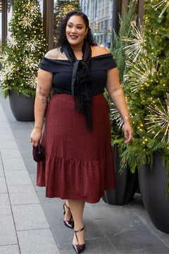 Rozpocznij sezon imprezowy z wielowarstwową spódnicą midi Snag Lurex w soczystym bordowym odcieniu czerwieni. Lśniąca i pełna świątecznej radości spódnica idealnie nadaje się do ruchu, blasku i wygody. Elastyczna talia o szerokości 6 cm (podszyta miękką bawełną, bo przecież nikt nie lubi drapiącego paska) gwarantuje idealne wsparcie i wygodę podczas całonocnych tańców.