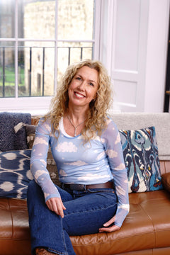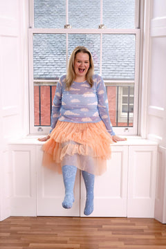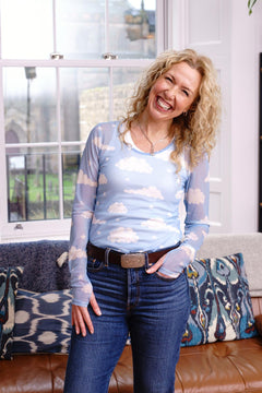 Dies ist ein halbtransparentes Top mit unserem exklusiven Wolken-Print auf einem sanften, himmelblauen Grundton, der mit bauschigen weißen Wolken und vereinzelten kleinen Sternen übersät ist.