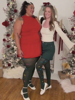 Sag hallo zu Fairy Lights, dem fröhlichen neuen Twist unseres geliebten Weihnachtsfavoriten von 2022. Diese aktualisierte Version hat eine Basis in sattem Flaschengrün (80 DEN) mit einer verspielten Spirale aus bunten Lichterketten, die sich an den Seiten beider Beine hochschlängelt. Von vorne siehst du perfekt elegant und winterlich aus, aber dreh dich um und ... Überraschung, du bist ein Weihnachtsbaum!! Das ist festlicher Spaß mit einem Hauch von Eleganz, perfekt für alle, die ein bisschen saisonalen Schabernack lieben, ohne auf Stil zu verzichten.