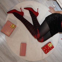 Lerne Gift Wrapped kennen, die festliche Strumpfhose mit Halterlos-Optik, die dir den ganzen Spaß und Flirt von Overknees bietet, ohne kalten Po oder den Kampf mit Strapsgürteln. Gefertigt auf einer glatten schwarzen 80 DEN Basis, erzeugt diese clevere Strumpfhose den Look von roten Tartan-Overknees, die am Bein hochlaufen und hinten an jedem Oberschenkel auf eine wunderschöne festliche Schleife treffen. Es ist die Art von Schleife, auf die Minnie Maus selbst stolz wäre, und sie verleiht deiner Weihnachtsgarderobe sofortigen Charme und Fröhlichkeit.