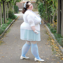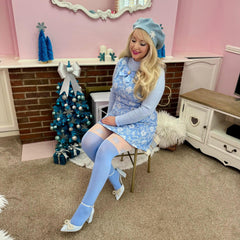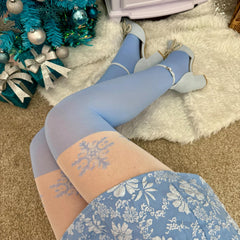 Lerne Snowflake Garter kennen, die magische 80 DEN Strumpfhose, die dir den Look von Overknee-Strümpfen verleiht, ganz ohne Stress. Gefertigt in unserem pastellblauen Denim-Farbton, mit einem zarten Schneeflockenband, das wie ein festliches Strumpfband den Oberschenkel umschließt, kreiert diese Strumpfhose einen umwerfenden Halterlos-Look, bevor sie in ein strahlend weißes Oberteil übergeht, das bis zum Bund reicht. Der ganze Charme von Overknees, aber kein kalter Po oder das Herumärgern mit Strapsgürteln.