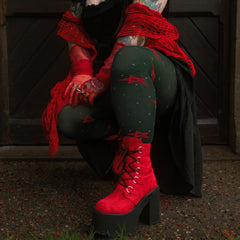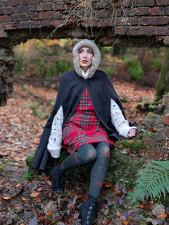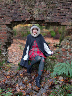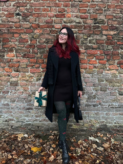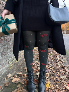 Tritt ein in die Saison mit Woodland Magick, unserer bezaubernden 80 DEN Strumpfhose, die sich anfühlt wie ein Streifzug durch einen dunklen, winterlichen Kiefernwald voller Weihnachtsmagie. Auf einer Basis in tiefem Farngrün (unserer Snag-Farbe Crocodile) sind leuchtend rote Pentagramm-Sterne und winzige graue Pünktchen über die Beine verstreut, alle raffiniert in den Stoff eingestrickt für ein glattes, nahtloses Finish. Festlich, verspielt und wunderschön einzigartig – sie bringen einen Hauch von Waldwunder und Wicca in jedes Outfit.