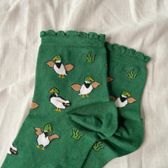 Eine ganze Bande entzückender Enten watschelt über einen satten dunkelgrünen Hintergrund. Sie sind perfekt für Tierliebhaber, für alle, die Lust auf einen ordentlichen festlichen Lacher haben, oder einfach für die Person, die die gemütlichsten Zehen am Weihnachtstisch verdient.