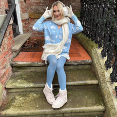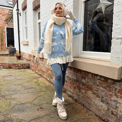 Einkuscheln und unseren neuen Wolken-Cardigan kennenlernen. Im gleichen Stil wie unser ausverkauftes Rainbeaux-Modell ist unser Wolken-Cardigan das kuschelige, brandneue Highlight unserer "Stars & Clouds" Kollektion. Dieser hüftlange Cardigan ist in unserem exklusiven Wolken-Print gestrickt, mit einem ruhigen, himmelblauen Grundton, der mit flauschigen weißen Wolken und kleinen Sternen übersät ist.