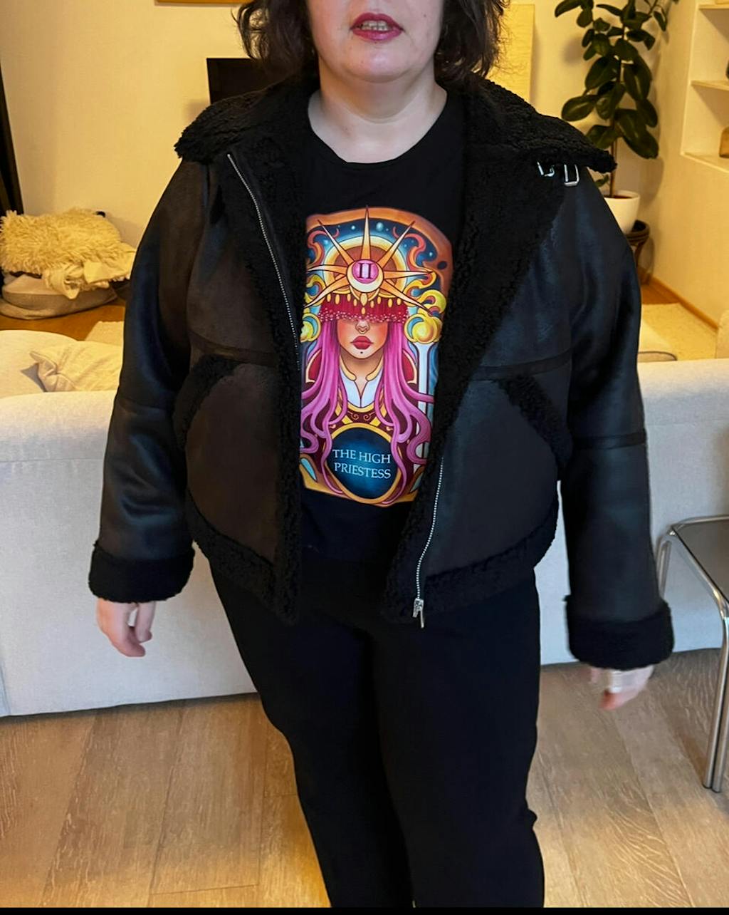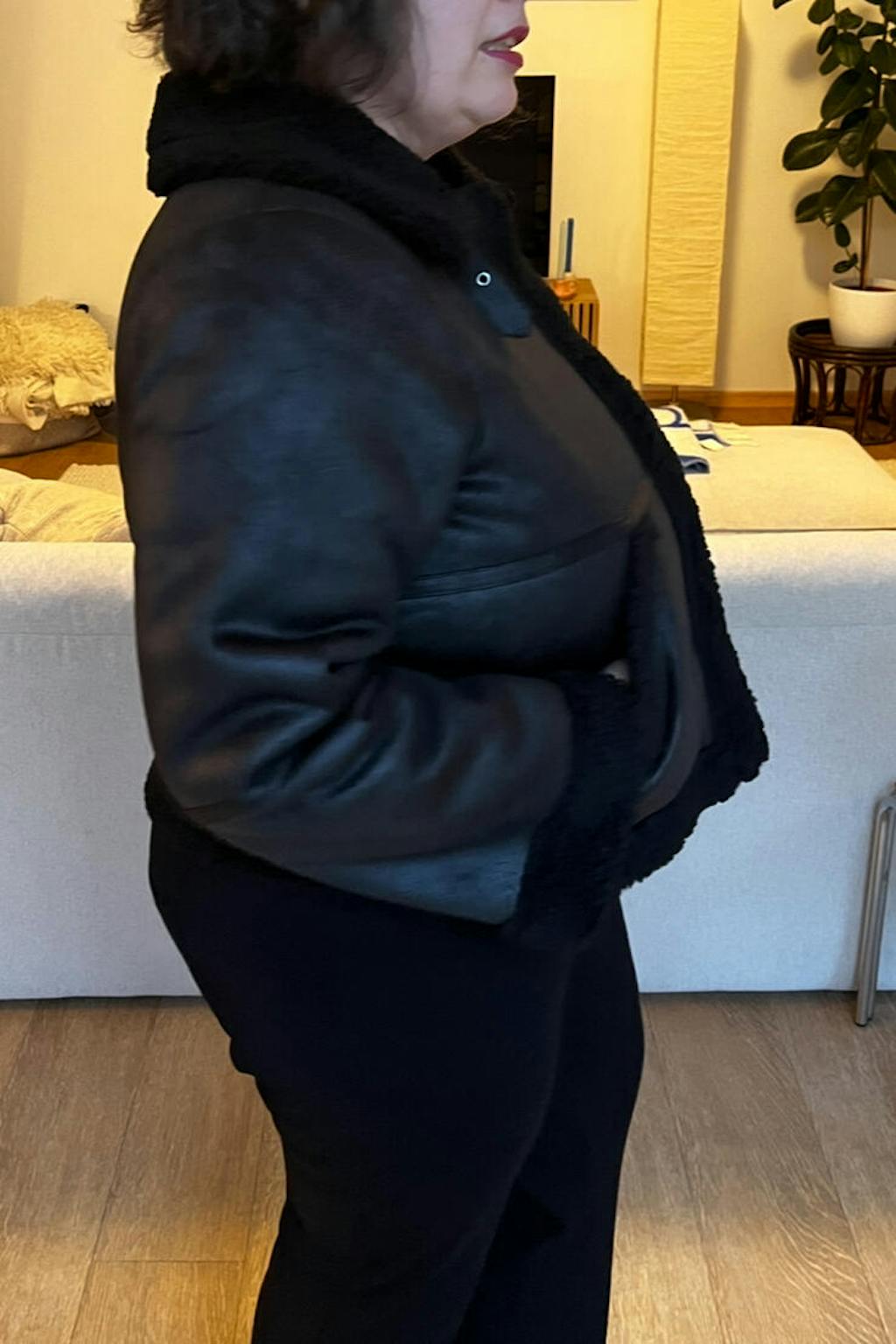 Schnall dich an und lern die schwarze Bessie Aviator Jacke mit Borg-Futter kennen! Das ist pure Aviator-Attitüde, verpackt in einer Teddybär-Umarmung. Diese vegane, kurz geschnittene Jacke besteht aus ultraweichem Veloursleder-Imitat mit plüschigem Borg-Besatz am Kragen und an den Ärmelsäumen. Zieh den Reißverschluss einmal zu und du bist sofort in puren Luxus gehüllt, der sich anfühlt, als hättest du an einem kalten Wintermorgen einfach deine Bettdecke mitgenommen.