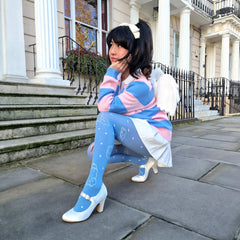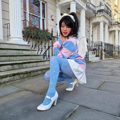Schwebe ein bisschen höher mit unserer „Woodcut Clouds“-Strumpfhose – hier trifft Alltagskomfort auf himmlische Tagträume. Auf einer Basis in kühlem Eisblau ziehen weiche, weiße Wolken und vereinzelte Sterne über deine Beine. Jede Wolke besteht aus wunderschön gezeichneten Linien, die an die haptische Handwerkskunst traditioneller Holzschnitte erinnern. Das Ergebnis ist ein Design, das zeitlos und kunstvoll zugleich wirkt – wie eine Wolkenlandschaft, die geduldig von Hand als Relief geschnitzt wurde.