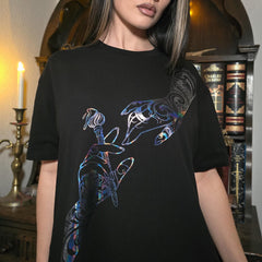 Fördjupa dig i Prythians förtrollade rike med SnagxACOTAR Bargain Tattoo ACOTAR T-shirt. Inspirerad av Feyres pakt med Rhys, är den ursprungliga, handritade designen applicerad med ett folietryck, holoshine, som skimrar olika beroende på stjärnljuset. Denna lättskurna t-shirt i ekologisk bomull är perfekt för kvinnliga eller manliga kroppsformer. Som officiellt licensierad ACOTAR-vara är denna t-shirt inte bara ett plagg; det är en del av den bestående ACOTAR-sagan som verkligen passar.