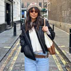 Schnall dich an und lern die schwarze Bessie Aviator Jacke mit Borg-Futter kennen! Das ist pure Aviator-Attitüde, verpackt in einer Teddybär-Umarmung. Diese vegane, kurz geschnittene Jacke besteht aus ultraweichem Veloursleder-Imitat mit plüschigem Borg-Besatz am Kragen und an den Ärmelsäumen. Zieh den Reißverschluss einmal zu und du bist sofort in puren Luxus gehüllt, der sich anfühlt, als hättest du an einem kalten Wintermorgen einfach deine Bettdecke mitgenommen.