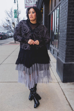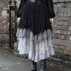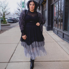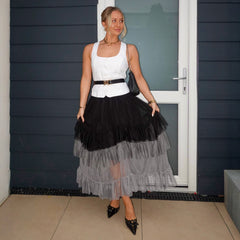 Manche Kleidungsstücke ziehen nicht nur Blicke an – sie ziehen dich in ihren Bann. Der Ombre Mesh Midaxi-Rock in Black verläuft in drei rauchigen Nuancen von Lichtgrau über Dunkelgrau bis hin zu tiefem Schwarz. Er ist gestuft, ätherisch und man kann einfach nicht wegsehen. Fließend, transparent und voller Bewegung fängt er das Licht ein und schwingt bei jedem Schritt mit.