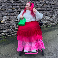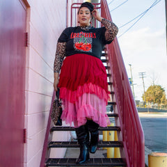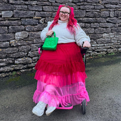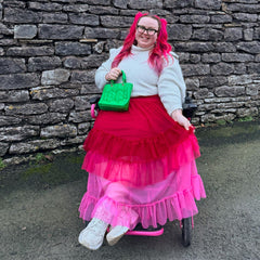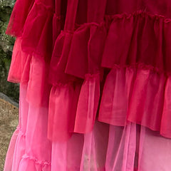 Farbe, Bewegung und pure Freude. Der Ombré Mesh-Midaxi-Rock in Pirouette fließt durch drei unverschämt selbstbewusste Pinktöne: Er beginnt mit Mini Milk, einem zarten Babyrosa am Saum, verschmilzt dann mit Lullaby, einem dramatischen Hot Pink, und endet mit Pirouette, einem leuchtenden Himbeerrot, das stolz an der Taille sitzt.