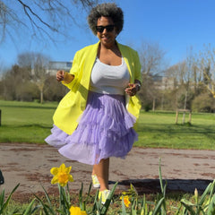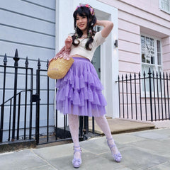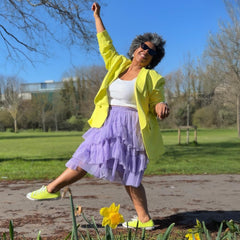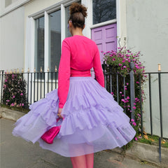 Urlaub auf Balkonien, but make it fashion. Beim Mesh-Rock in Lavendel dreht sich alles um dieses fließende, schwerelose Gefühl, das einfach alles ein bisschen magischer macht. Drei Stufen aus weichem Mesh bewegen sich mit dir, fangen das Licht ein und zaubern diese mühelose, verträumte Silhouette, die alltägliche Momente in etwas ganz Besonderes verwandelt.